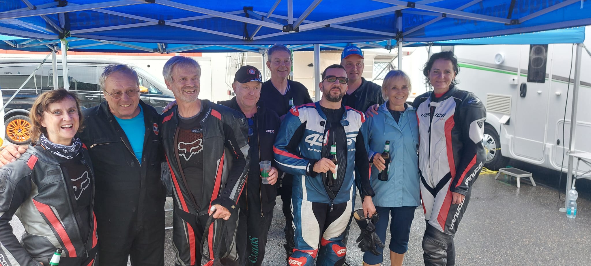 Wir hatten zusammen mit 4 befreundeten Gespannen im Fahrerlager aufgebaut. Der Tisch im Mannschaftszelt wurde daher von Abend zu Abend länger. Ein wunderschönes Wochenende mit vielen guten Gesprächen. Den Dialog zur IDM- Szene konnten wir erweitern. Das sind die schnellen, modernen Gespannen mit gut 200 PS. Da wo wir vor der Postkurve bei ca 180 km/h bremsen, schalten die nochmal hoch. Unsere Technik hielt gut, Michael ging das Getriebe fest und die Vergaser von Christoph sind übergelaufen. Ein größere Menge Benzin ging in der rechten Rampenkurve direkt aufs Hinterrad, sodass er in die Strohballen musste. Zum Glück ist außer Verkleidung und Auspuff nichts beeinträchtigt worden.