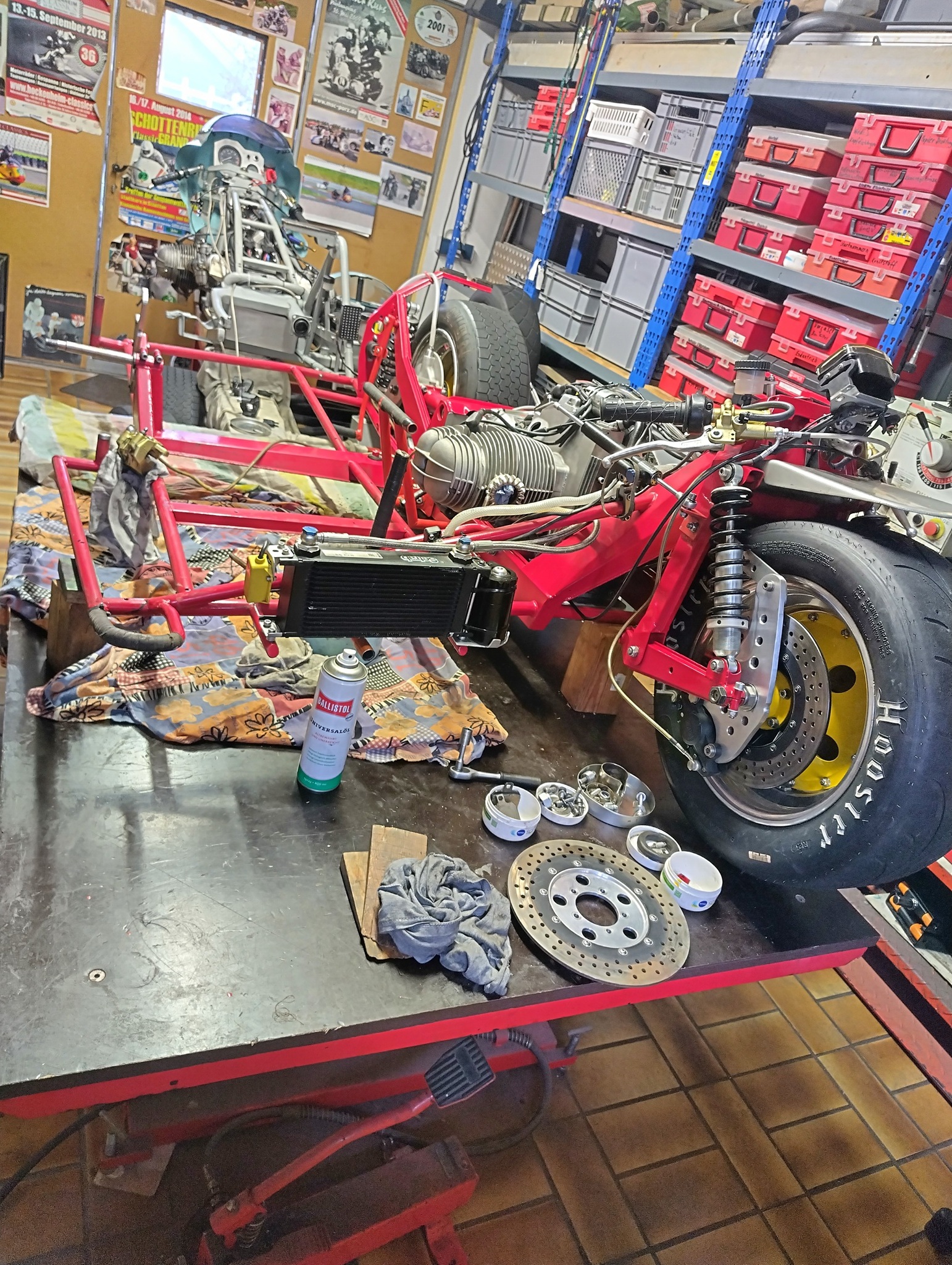 Das Gespann ist auseinander. Reifen werden gewechselt, das Beiwagenrad soll verbreitert werden, der Lenker 10 cm nach vorn. Ob wir das bis zur Einstellfahrt im März in Hockenheim schaffen ist noch nicht klar.