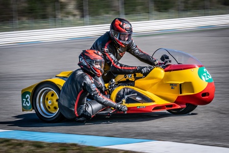 In den sechs Meisterschaftsläufen starteten sie in der C / Q / Y-Klasse. Jan und Susanne unter der Startnummer Q 3. Hinter den Buchstaben vor der Startnummer, verbergen sich technische Maße und Daten die das Renngespann in die passende Zeitepoche und Leistungsgruppe zu ordnen. Die Leistung der C / Q / Y Gespanne ist recht ähnlich und lässt die Gespanne schon mal nahe der 200 km/h kommen. Höchstgeschwindigkeit ist aber nicht alles. Viel wichtiger ist die Geschwindigkeit die man in den Kurven auf den Asphalt bringt. Wenn man dort leicht driftend über alle drei Räder rumkommt, ist das die physikalische Grenze die man nicht überschreiten soll. Eine Kurve in vollem Drift zu nehmen, sieht spektakulär aus, kostet aber Zeit. Außerdem hat der Beifahrer wirklich zu kämpfen um im Boot (Beiwagen) zu bleiben. Zumal in diesem Jahr recht viele Beifahrer aus dem Boot gefallen sind.