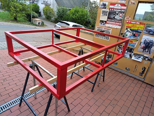 2024/25 Ein Schiebegestell (58 cm hoch) für ein Renngespann gebaut. Das Gespann wird dann direkt vom oder auf den Hänger, geschoben.